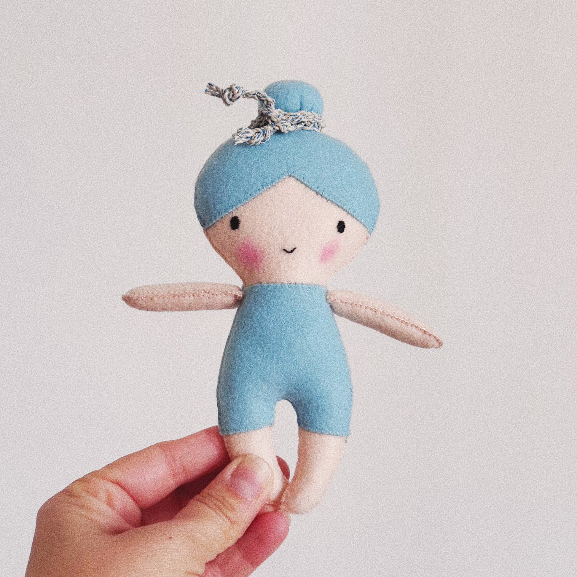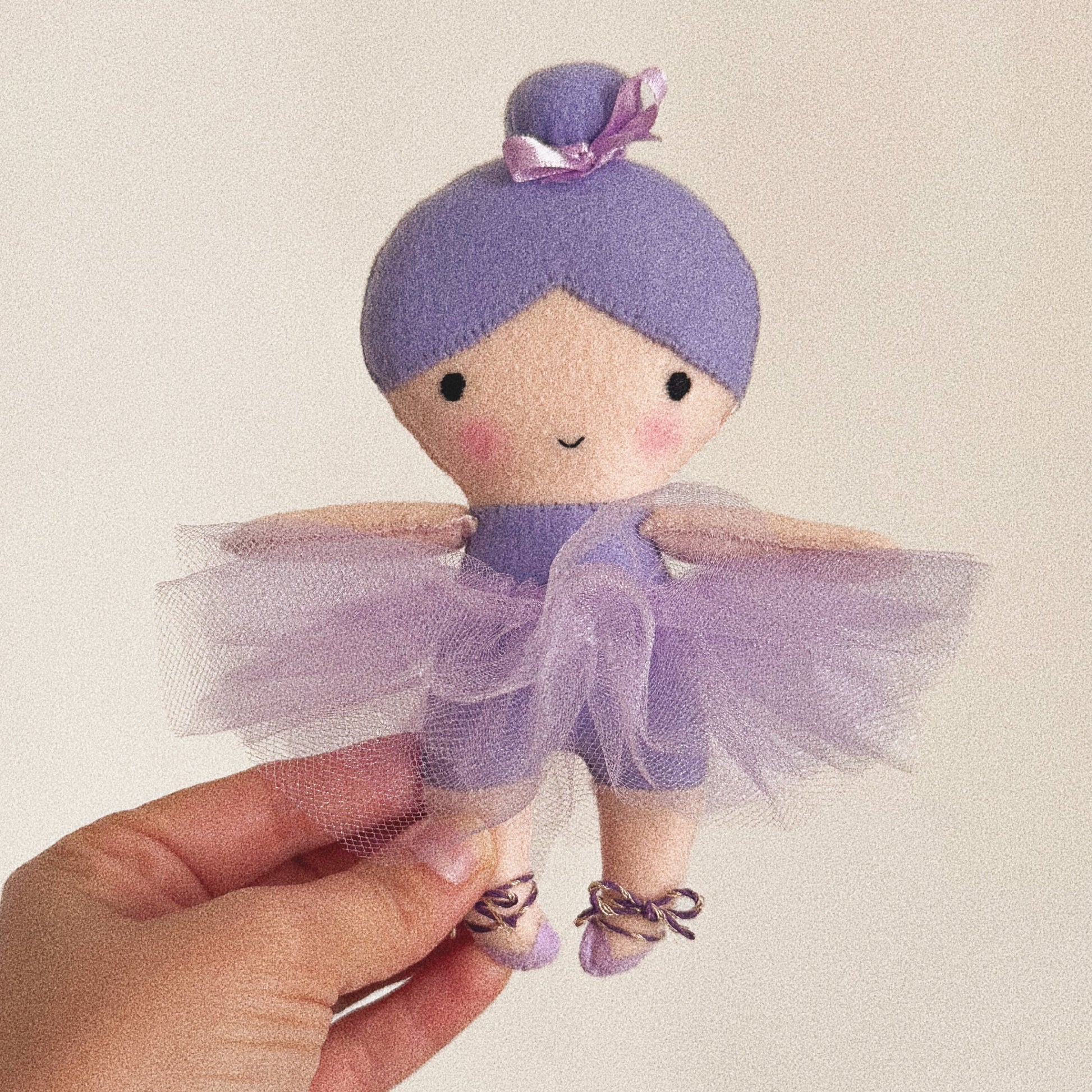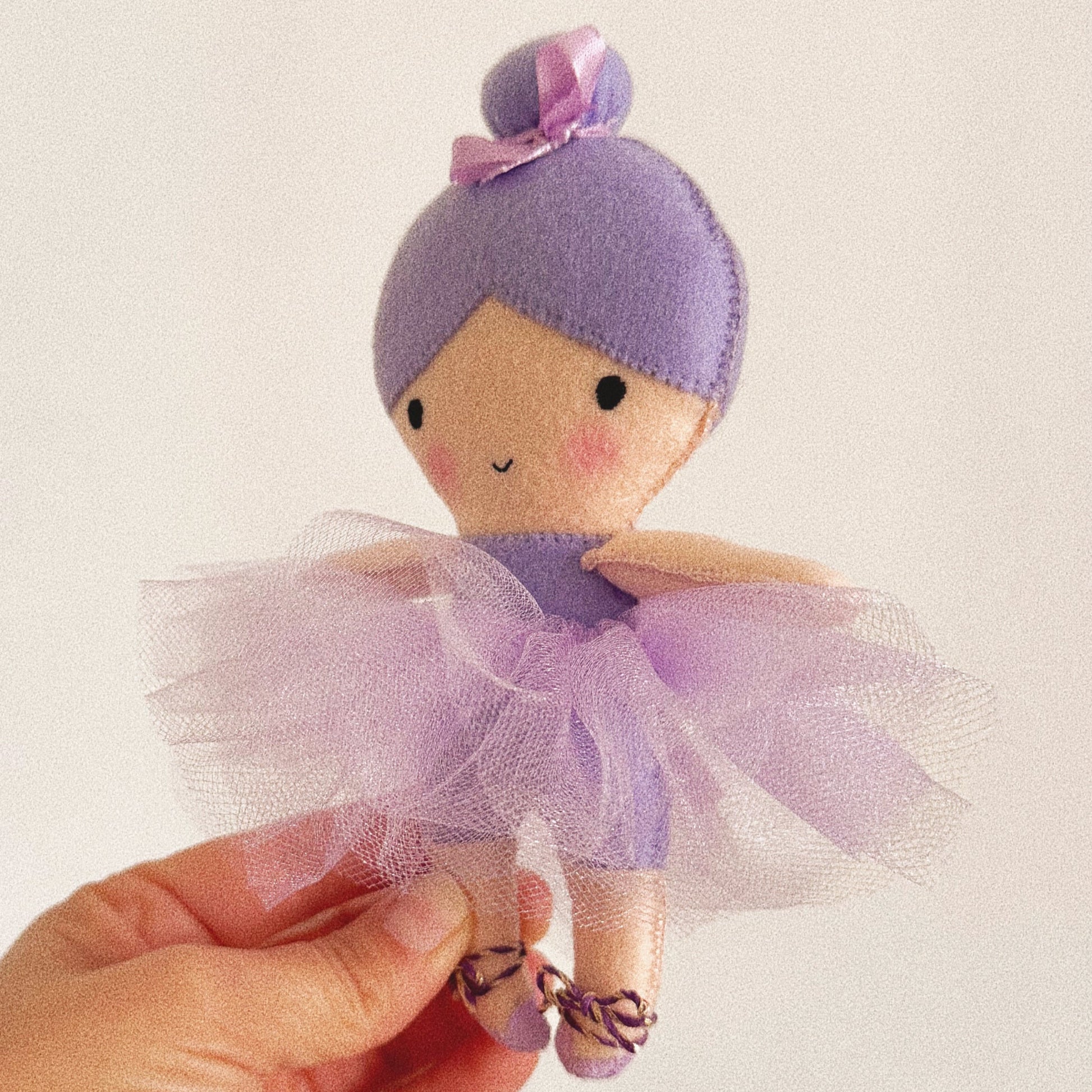 This felt ballerina doll is name Emma, and it is completely handmade, with the recycled felt fabric materials and with a lot of love. She has wool hair, and a cute hand-painted vest. A little bell on her hat. It is ideal for children to play or to decorate a children's room. Give joy to your baby's room with these little dolls.